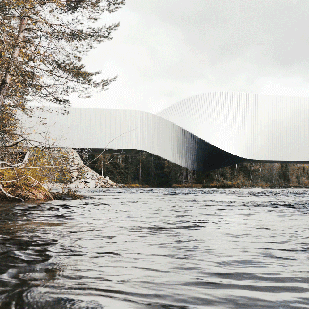 Showcasing The Twist: a unique structure situated between scenic Norwegian forested riverbanks